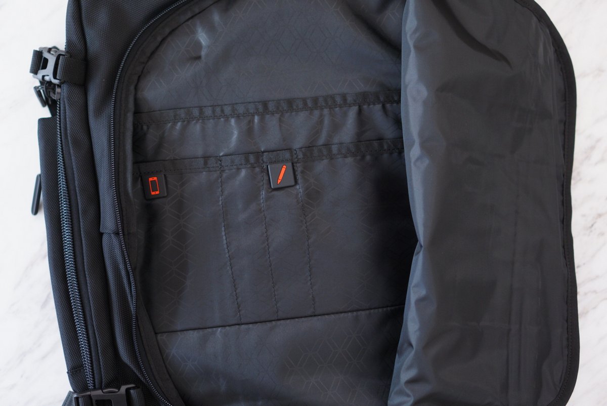 ▼Blazer後背包背帶外側還有一個額外夾層,但要注意位於底部的兩側是有孔洞的,這個夾層主要可將背帶卸除後收納進去,使背包變成橫式拿取(請看下圖收納一邊背袋的狀態),橫式的背包狀態可藉由行李箱插桿的輔助移動。這個夾層在沒有收納背袋的狀況下,還可以當作收納少量髒衣服的空間