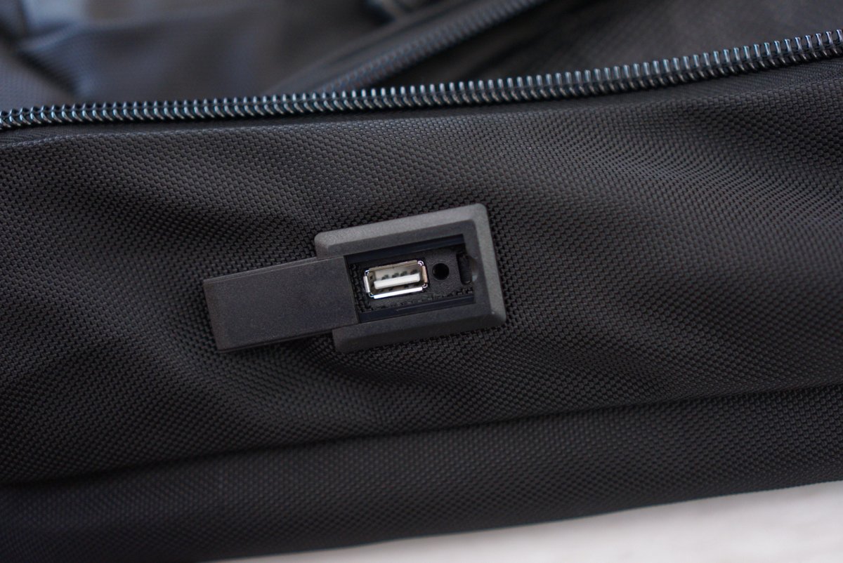 ▼主袋是Blazer後背包最大的收納空間,拉鍊採用雙開的方式,方便將背包主袋空間完全展開。側邊有一個USB充電口,具備一個USB-A母孔與3.5mm音源線,如果要充電或聽音樂,可將行動電源、播放器(或手機)放在主袋的網袋中。若沒需要這麼大的主袋空間,可透過四周的活動式扣環,將背包縮小固定在需要的尺寸