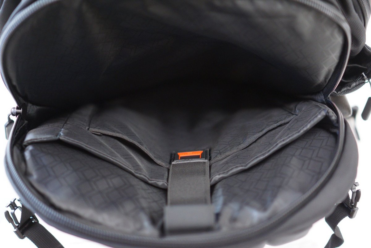 ▼22L的Track後背包有設計胸前扣環,上頭還有哨子的設計。前袋內的設計為固定的夾層空間。主空間可放置15.6吋筆記型電腦與平板電腦,除此之外主袋內還有拉鏈口袋與兩側的彈性網袋,可將行動電源放在網袋連接至外頭的充電孔充電